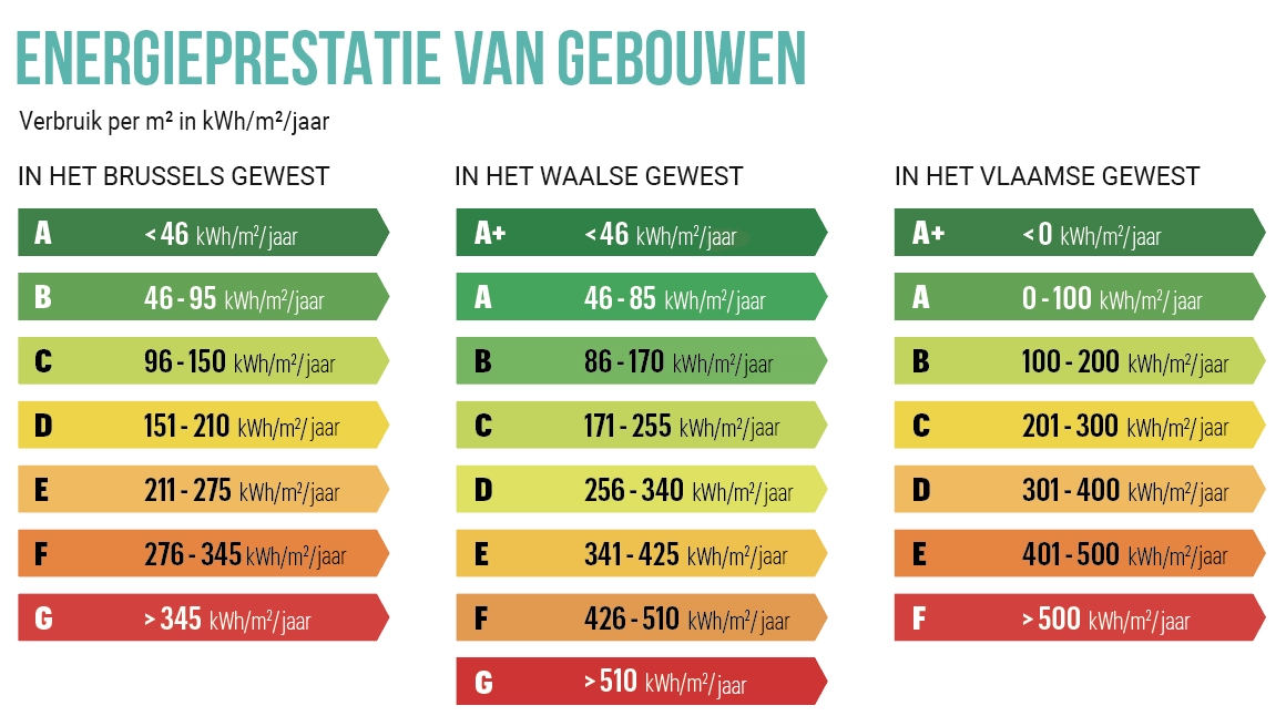 De energiescores variëren volgens de drie gewesten in België, waarbij strengere criteria gelden in Brussel. Een verbruik van bijvoorbeeld 96 kWh/m²/jaar krijgt score A in Vlaanderen, B in Wallonië en C in Brussel.
